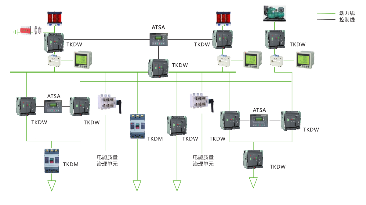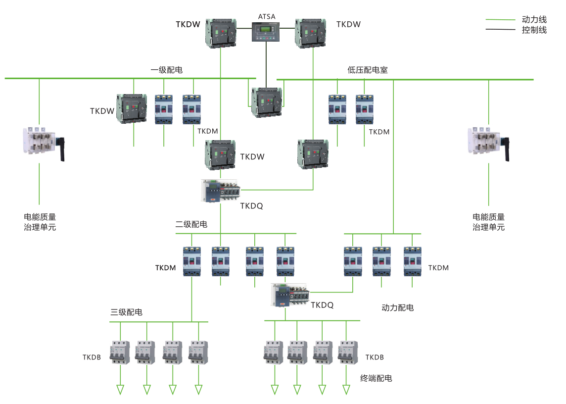 TKDQ1系列双电源自动转换开关是由TKDM系列塑壳断路器(三极或四极)及其附件、机械联锁传动机构、智能控制器等组成,产品分为一体式、分体式两种结构。